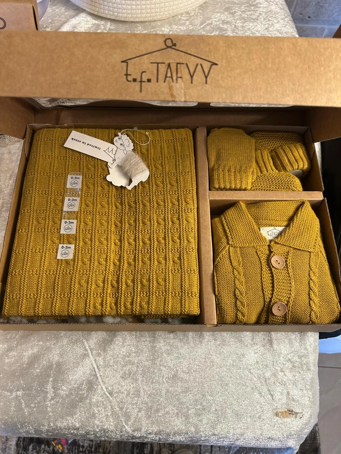 מארז לידה בצבע חרדלי מיוחד שכולל אוברול שמיכה כובע גרביים וכובע