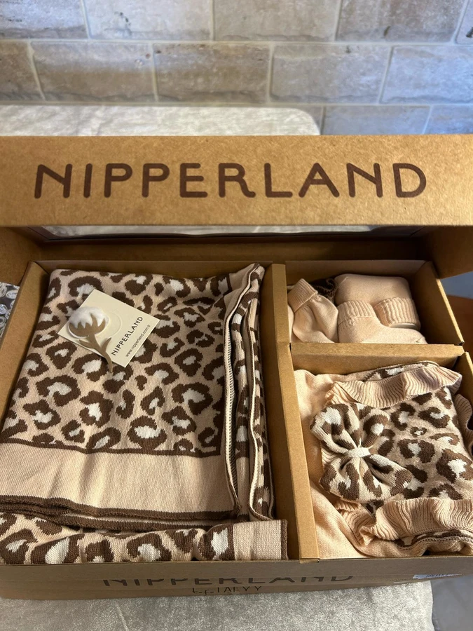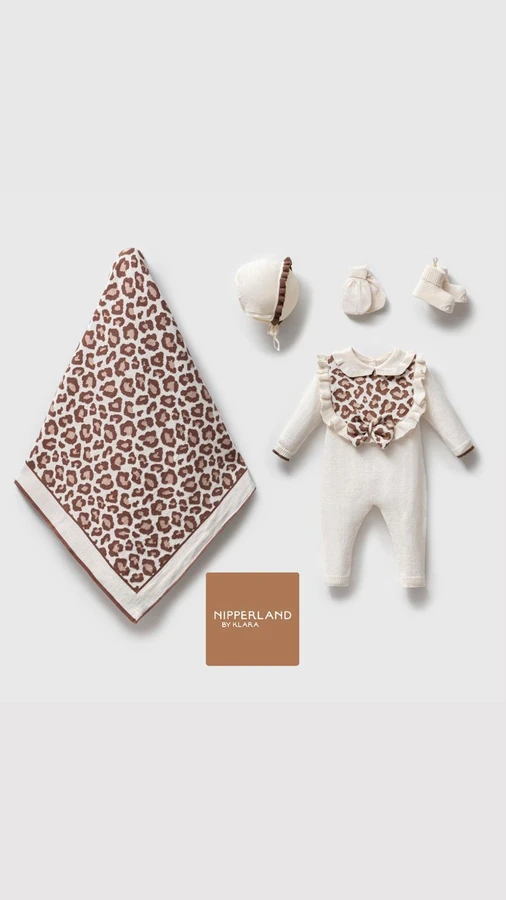 מארז לידה בצבע מנומר מיוחד שכולל אוברול שמיכה כובע גרביים וכובע